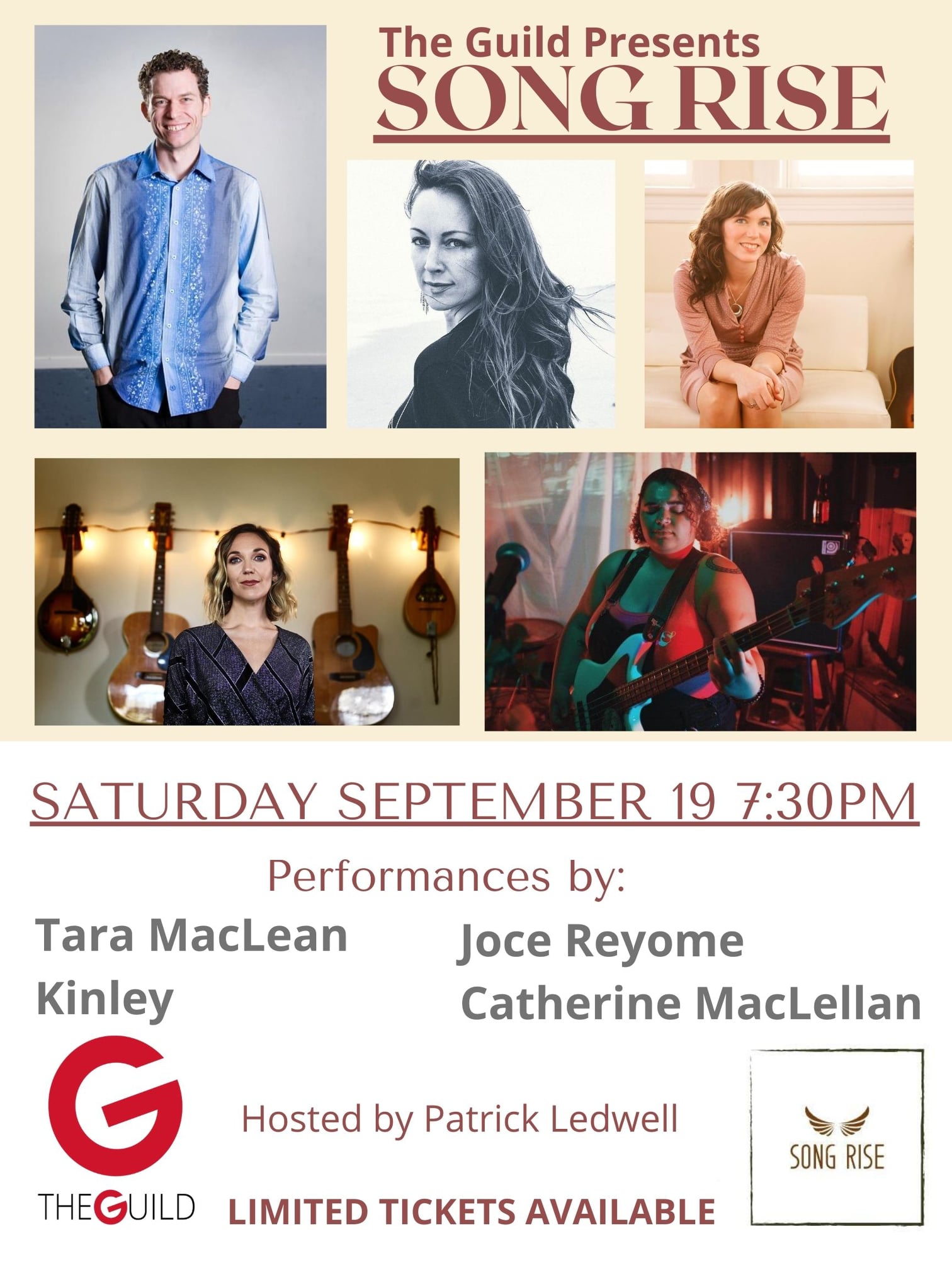 Song Rise is a circle of local songwriters, hosted by Patrick Ledwell, and presented by The Guild in Charlottetown, PEI. Like other song circles, there will be stories and tunes, but this will also be an interactive experience with an on-line audience through live stream accessible all over the world. Four amazing songwriters each night will entertain a socially distanced live audience. It will be an intimate, passionate, and powerful experience for those in attendance and those watching from home. Each group has been carefully curated for optimal chemistry.