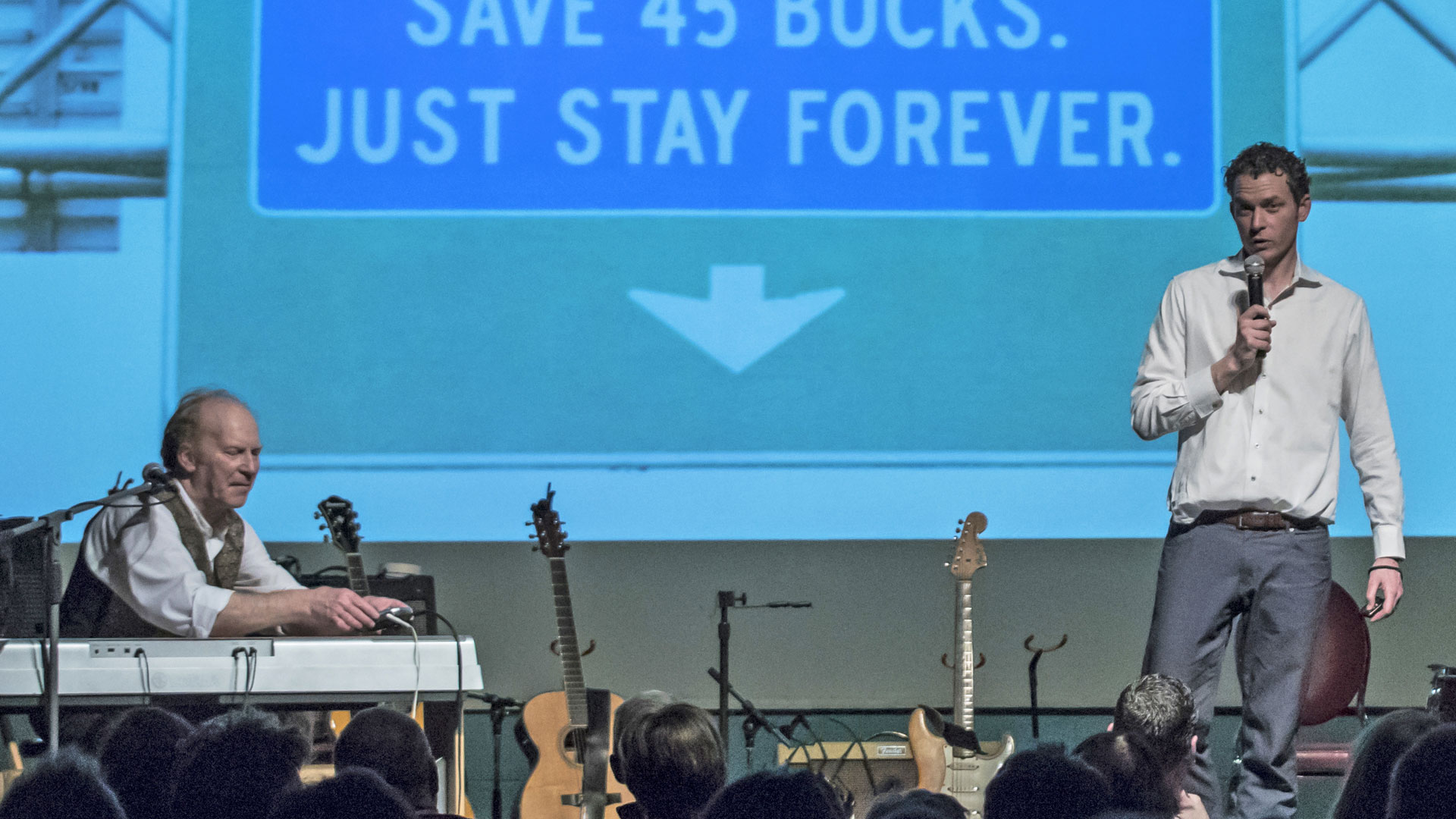On the nightly menu, there’s stand-up comedy, traditional and contemporary music, mock-informative projected slideshows, and new combinations at every curve. The Ledwell and Haines show sets out to leave the theatre rafters ringing, with hand clapping, laughter, and lots of crowd singing and participation.